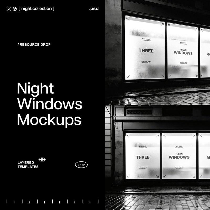 The Night Windows Mockup includes 2 high-quality PSD files, each measuring 4500x3000 px at 300 dpi, designed for easy customization with Smart Objects. Compatible with Photoshop, this mockup provides a clean and realistic presentation for showcasing designs.