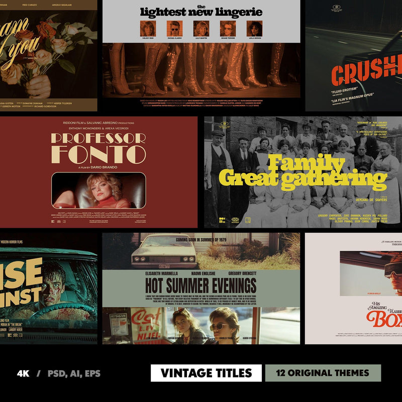 The Old Movie Titles Collection features 12 retro-inspired title templates, each designed to reflect different eras and genres of film. These fully editable templates are available in high-resolution 4K (3840x2160px, 300dpi) and come in PSD, AI, and EPS formats, compatible with Photoshop and Illustrator.