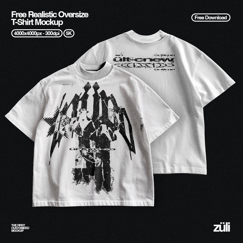The Oversized Realistic T-Shirt Mockup 5K features ultra-resolution quality and includes both front and back views of the t-shirt, designed with perfect sizes and a guidelines layer for easy design fitting. It is compatible with Photoshop and comes with a PDF file for optimal use.