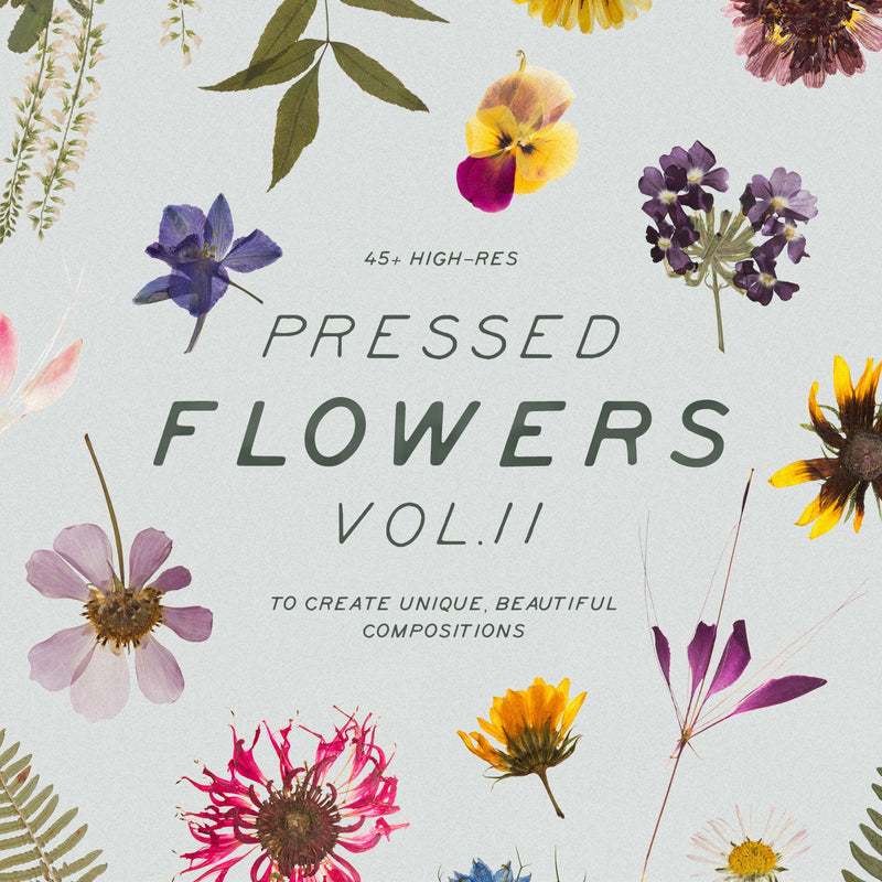Pressed Dry Flowers & Herbs Vol.2 is a comprehensive collection of over 45 meticulously photographed and cut-out pressed and dried flowers and herbs. This set offers a wider variety of colored flowers compared to its predecessor, Vol.1, and is compatible with any program that supports PNG format, including Photoshop, Illustrator, Lightroom, After Effects, Affinity Designer, Affinity Photo, Indesign, Procreate, Sketch, Figma, and Canva.