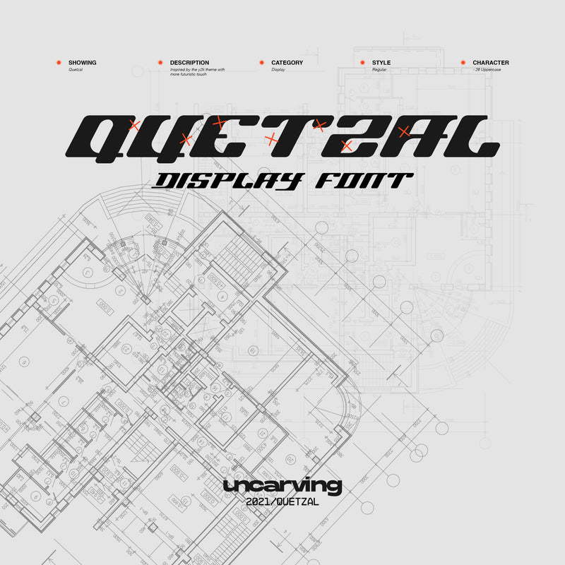 Quetzal is a modern, bold-themed typeface with a unique, simple design and an italic touch. It's suitable for projects related to gaming, future tech, space travel, virtual reality, and more. This product is tagged as apparel, futuristic, display, poster, typeface, Y2K, fonts, cyberpunk fonts, Y2K fonts, and display fonts. Compatibility is not specified.