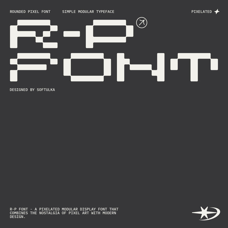 The R-P Font is a pixelated modular display font that merges pixel art nostalgia with modern design. It features rounded corners for a friendly yet professional look. The package includes 1 OTF file, 1 TTF file, 1 WOFF file, and a PDF preview. It's ideal for digital media, gaming, and tech-related branding.