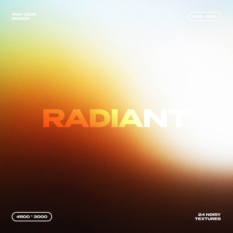 Radiant Chrome Gradient Textures includes 24 high-quality JPG and PNG files, each measuring 4500 × 3000 px at 300 dpi. These textures feature a radiant color haze with a blown-out center glow, soft gradient falloff, and fine noisy grain, transitioning from warm orange to cool green. Compatible with various design software, they provide versatile options for creating backgrounds and overlays.