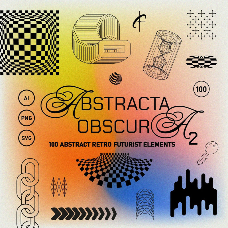 The Retro Futurist Abstract Collection 2 is a part of the Abstracta Obscura Set, featuring vectorised objects and symbols in a psychedelic retro style that explores future technologies and the metaverse. The pack includes 99 abstract urban futurist shapes and a bonus vector seamless texture, compatible with Illustrator, Photoshop, Affinity Designer, Figma, Sketch, and Canva.