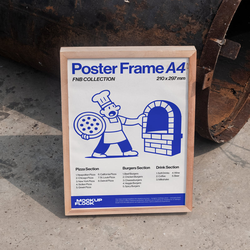 The Rp Poster Frame Mockup 02 is a high-quality mockup designed for Adobe Photoshop, featuring a realistic outdoor setting with a textured concrete background and natural lighting. It has dimensions of 6000px x 4000px at 300 dpi and is suitable for showcasing various design presentations.