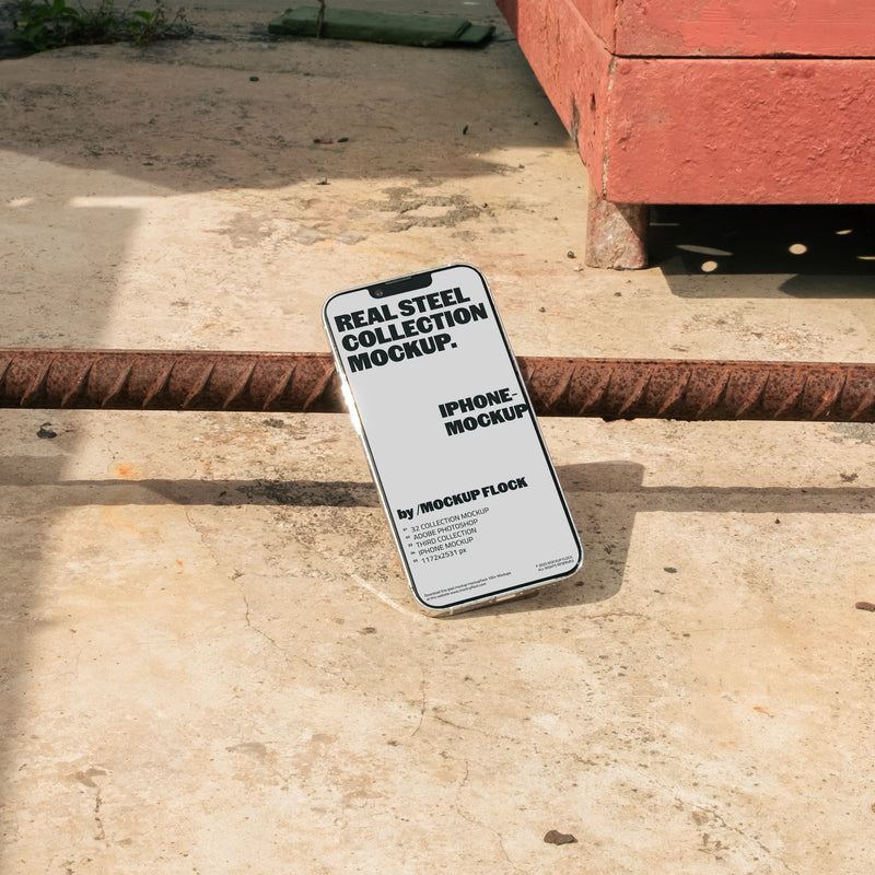 The RS iPhone 03 Mockup is designed for Adobe Photoshop, featuring a clean iPhone screen set against a rugged industrial steel background. It has dimensions of 6000px x 4000px at 300 dpi, providing a high-quality template for showcasing mobile designs.