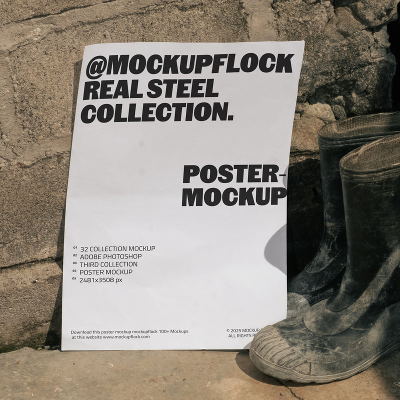 The RS Poster 03 Mockup is designed for Adobe Photoshop, featuring a textured industrial background with a pair of boots for a rugged aesthetic. It includes a high-resolution template (3000px x 4000px at 300 dpi) for showcasing poster designs in a realistic urban setting.