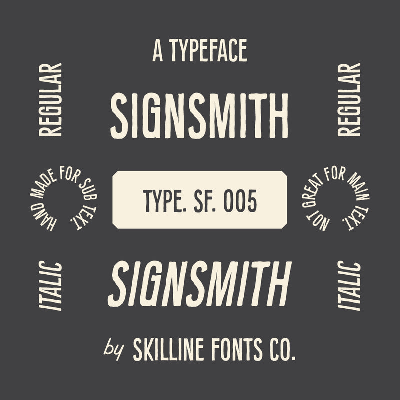 SFC Signsmith is a condensed hand-drawn display typeface that features bold strokes and a handcrafted texture, available in regular and italic styles. It combines vintage sign painting traditions with strong readability, making it suitable for various design applications.