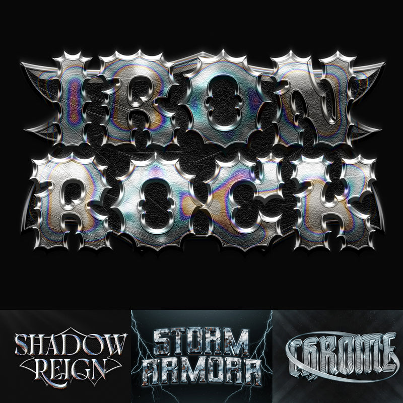 Heavy metal chrome text effects pack featuring dark metallic textures, sharp edges, embossed steel surfaces, and dramatic lighting effects. Designed to create powerful, aggressive, and cinematic typography with bold chrome and industrial finishes.