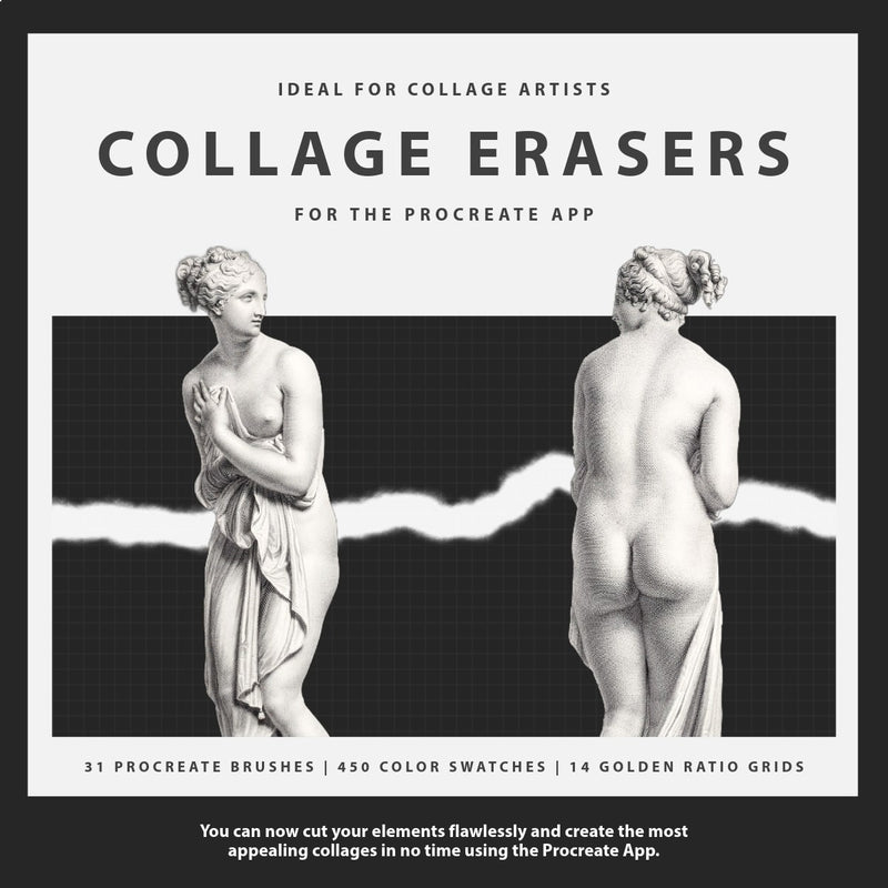 The Collage Eraser Procreate Brushes are designed for collage artists and graphic designers, featuring 17 eraser brushes, 450 color swatches, 15 color palettes, 14 golden ratio stamps, and 14 golden ratio grids. This package also includes a practice illustration, a tutorial video, and 24/7 support, all compatible with the Procreate app.