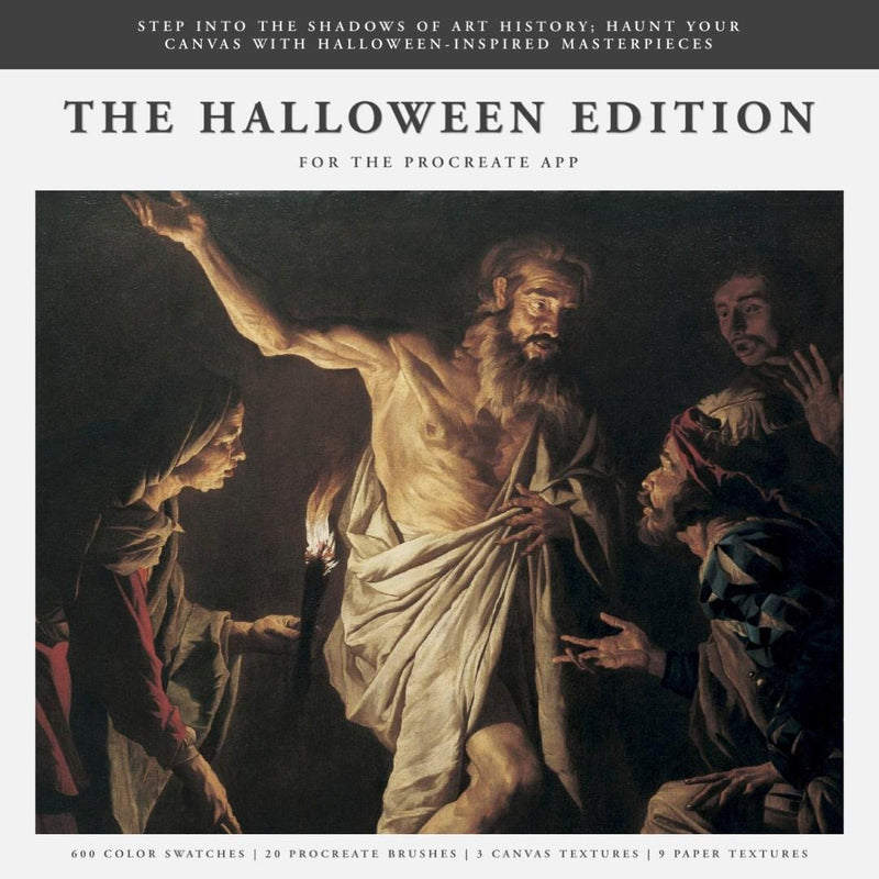 The Halloween (2024) Procreate Kit includes 600 color swatches, 20 brushes, 9 paper textures, and 3 canvas textures, all designed for use with the Procreate app on iPad. This kit is inspired by classic artists and provides essential tools for creating Halloween-themed digital artwork.