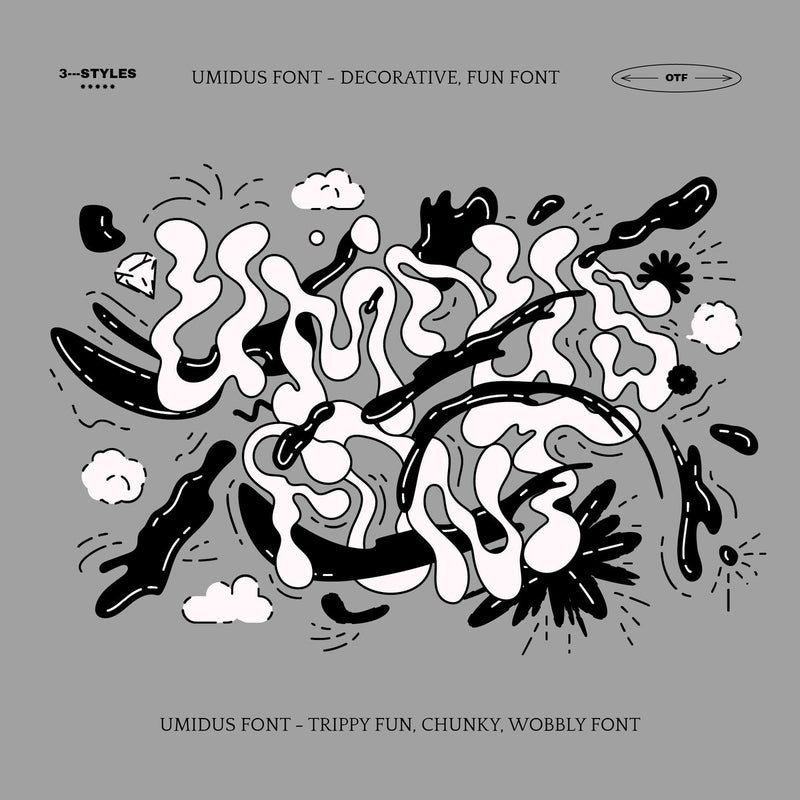 The Umidus font - Trippy Liquid Font is a wavy, liquid decorative font, ideal for bold titles. The package includes 3 OTF, TTF, and WOFF files each in three styles: plain black, transparent outline, and black with highlights. It also comes with AI, EPS, and PDF vector files with editable strokes of highlights. Please note, the font does not include any photos, textures, or effects.