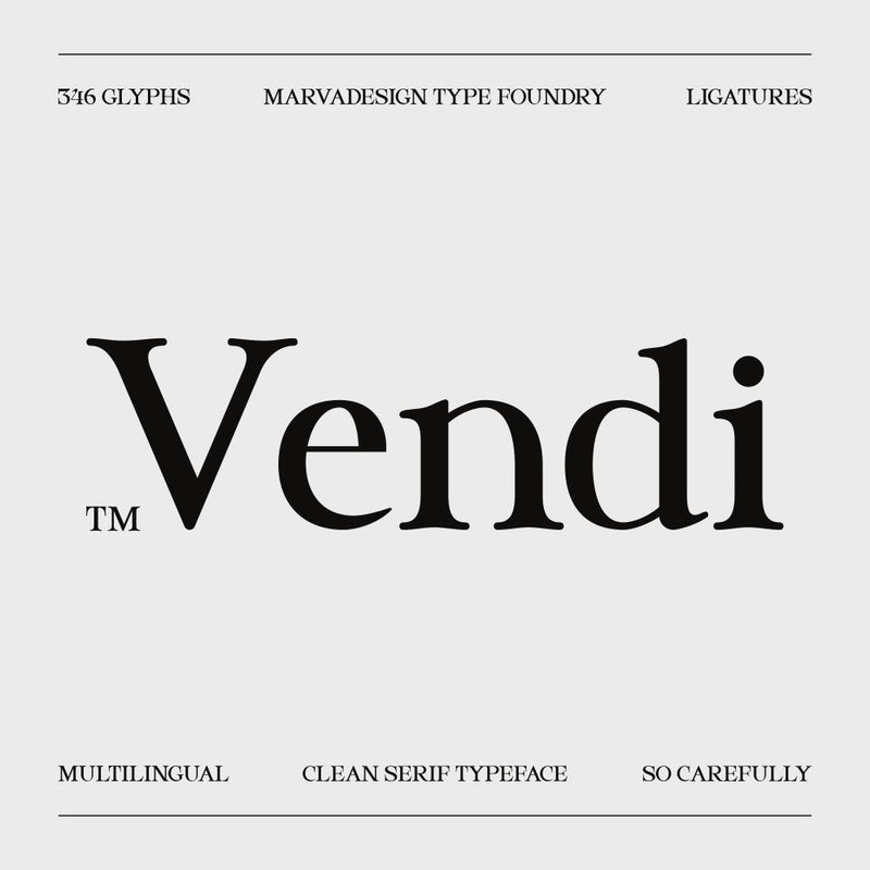 Vendi is a stylish Serif typeface featuring clean lines and unique slightly curved serifs that distinguish it from traditional Serif fonts. This font combines classic sophistication with a modern twist, making it suitable for a variety of design projects.